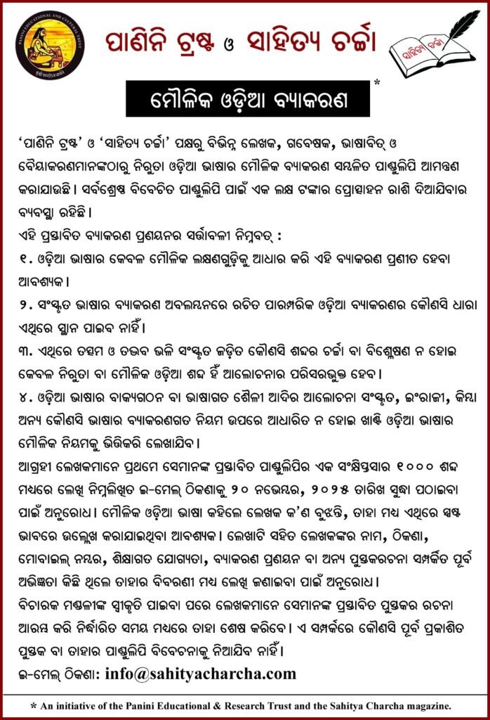 ଓଡ଼ିଆ ଭାଷାର ମୌଳିକ ବ୍ୟାକରଣ ସମ୍ବଳିତ ପାଣ୍ଡୁଲିପି ଆମନ୍ତ୍ରଣ